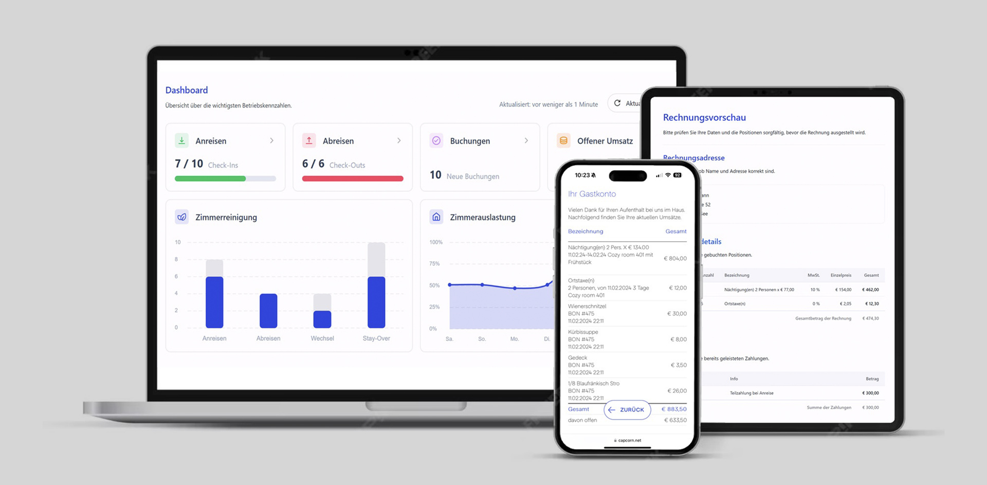 Die CapCloud ermöglicht erstmals eine Reihe moderner Funktionen, die direkt auf Tablets und mobilen Geräten genutzt werden können – ideal für Rezeption und Gäste.